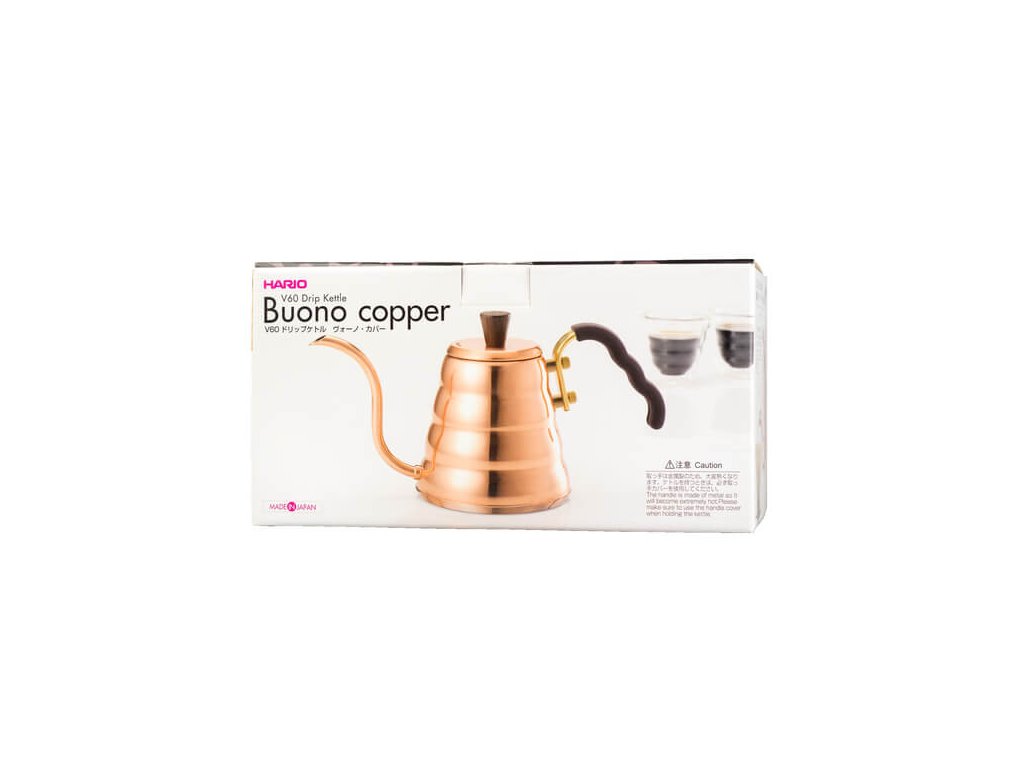 Měděná konvice Hario Buono 0,9 l je dokonalým nástrojem na alternativní přípravu kávu. Oceníte na V60, Chemex, Aeropress nebo další filtry. Díky dlouhému a úzkému tvaru nálevky dosáhnete rovnoměrnému zalévání namleté kávy, což je klíčové pro správnou přípravu kávu. Za vyšší cenu získáte originální provedení v podobě měděné verze, díky čemuž se konvice ohřívá vodu rychleji. Konvice není vhodná na indukci.